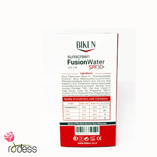 ضد آفتاب فیوژن واتر بیکن SPF30 دارای ویژگی های زیر است: