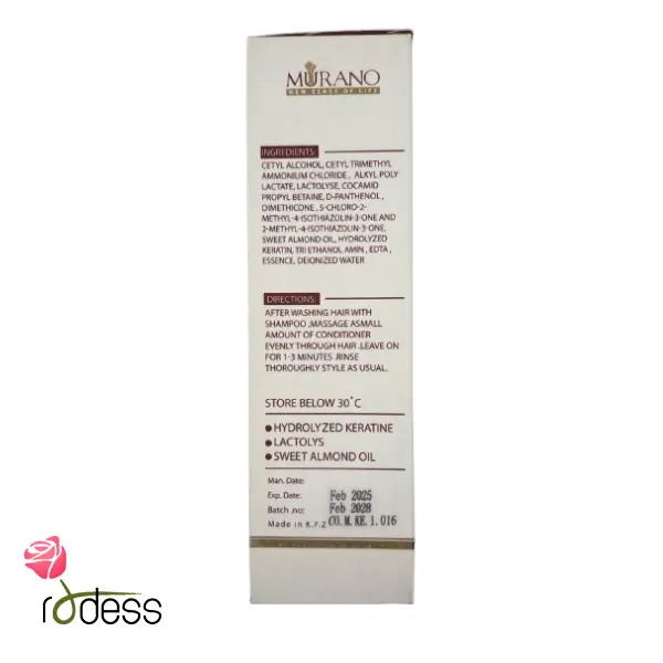 نرم کننده حاوی کراتین مورانو (Murano) برای تغذیه موها گزینه مناسبی است و از ریزش موها به طرز شگفت انگیزی جلوگیری می کند. همچنین در ظاهر مو نیز تاثیر گذار است و نرمی، لطافت و درخشندگی را به موها بازمی گرداند. کراتین موجود در این محصول نقش مهمی در ترمیم و بازسازی ساختار مو ایفا می کند و با نفوذ به عمق ساقه مو، موجب افزایش نرمی و لطافت طبیعی آن می شود. این نرم کننده می تواند الکتریسیته ساکن مو را از بین ببرد و از وز و فری شدن مو جلوگیری کند و در نتیجه موها لخت خواهند شد و جلوه ای زیبا را به نمایش در می آورند.